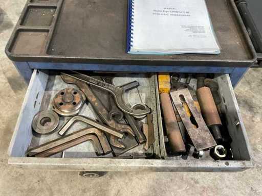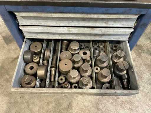 Punch cap. Ø 38 x 11 mm or Ø 28 x 15 mm; Scissor cap. 200 x 20 mm or 300 x 15 mm; Cut corner cap. 120 x 12 mm; Cut around cap. 40 mm; square 35 mm; equipped with foot control; incl. tool trolley with various accessories