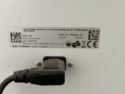For sale is a powerful air purifier from the renowned German manufacturer Krug & Priester GmbH, model IDEAL AP140 PRO, manufactured in March 2021. The cleaner is ideal for large rooms, offices, meeting rooms, production or storage areas with high air circulation capacity and professional filter technology.