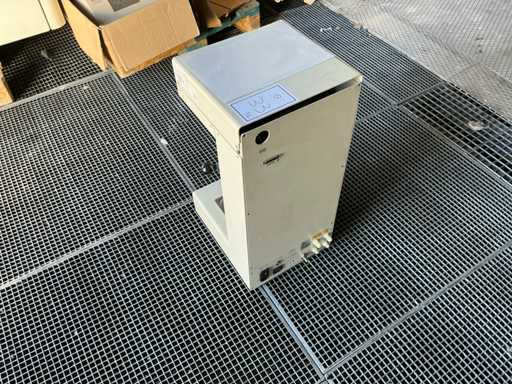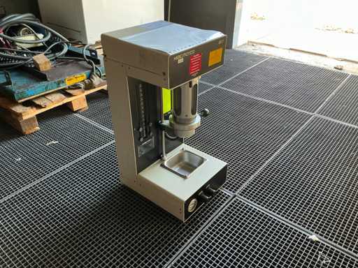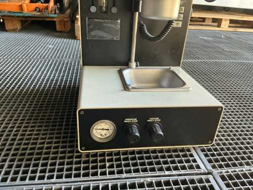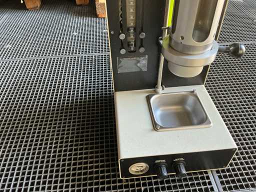 Laboratory equipment for the measurement of particle contamination in liquids, with flow control system, regulating valve and analysis chamber.