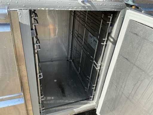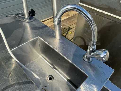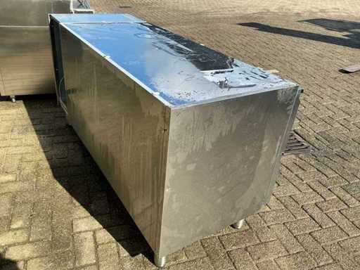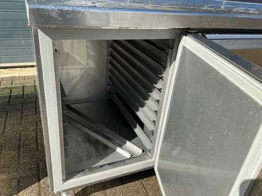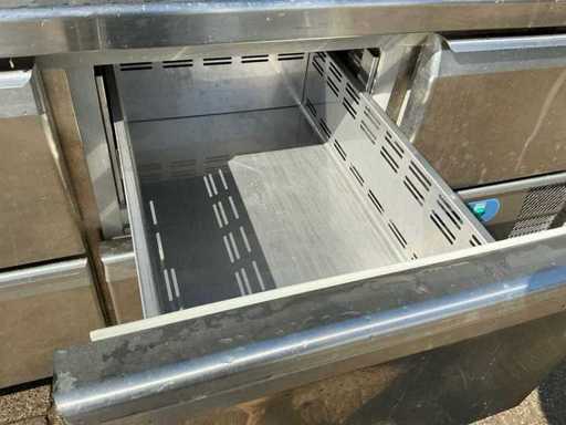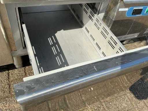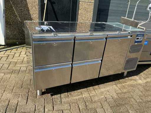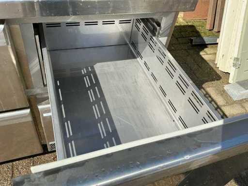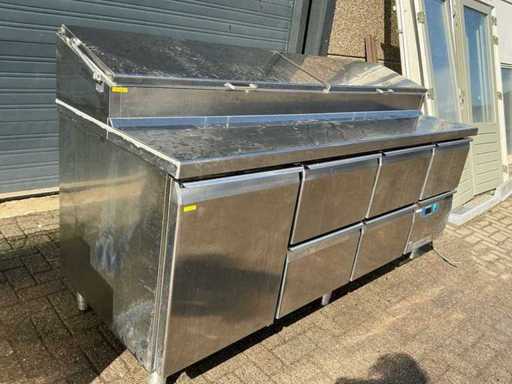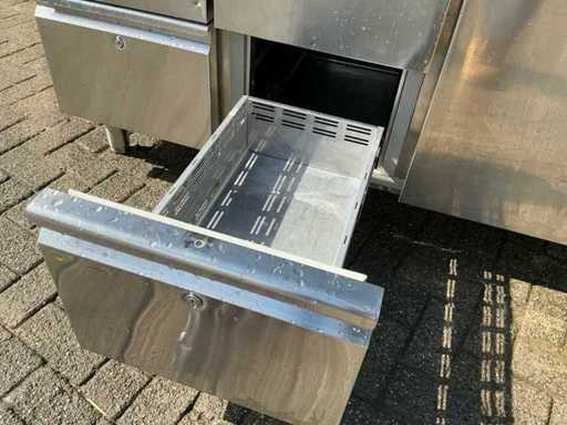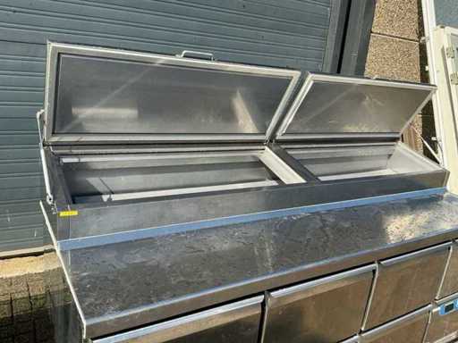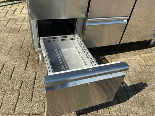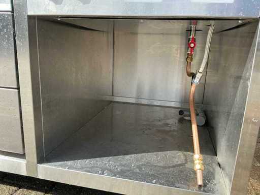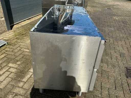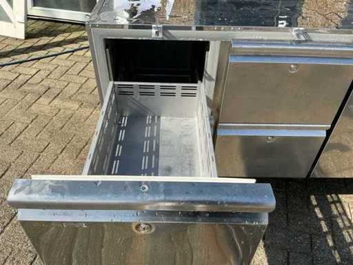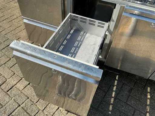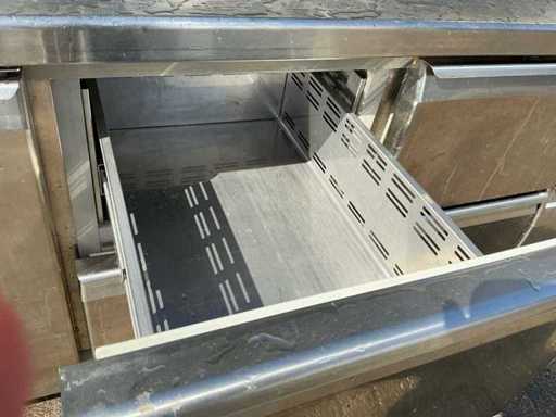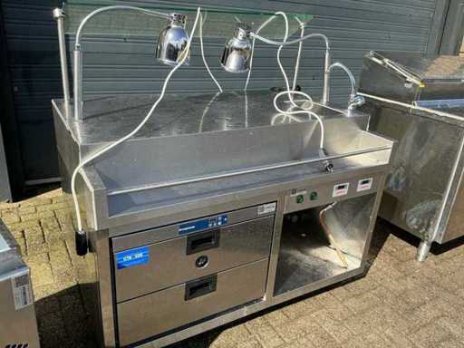 Equipped with: Metos heat holder with sink with faucet double heat lamp 136x85x83 Refrigerated workbench Metos with various drawers and salads 217x80120 Refrigerated workbench Metos with various drawers and gastronorm trays