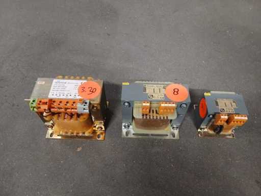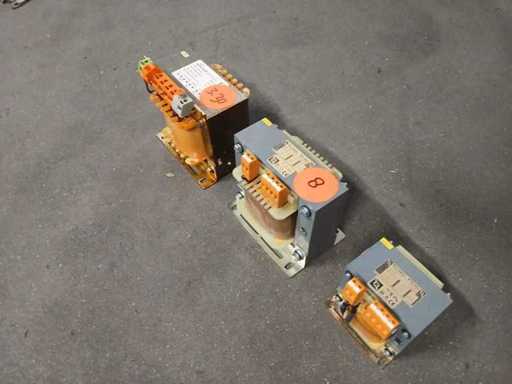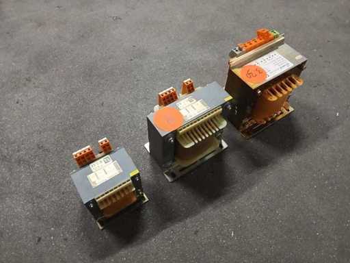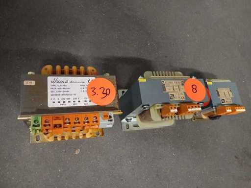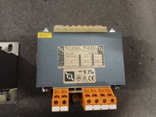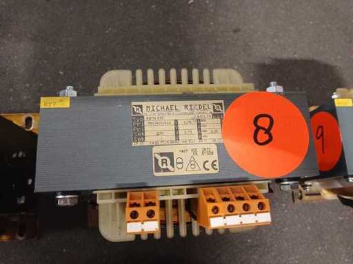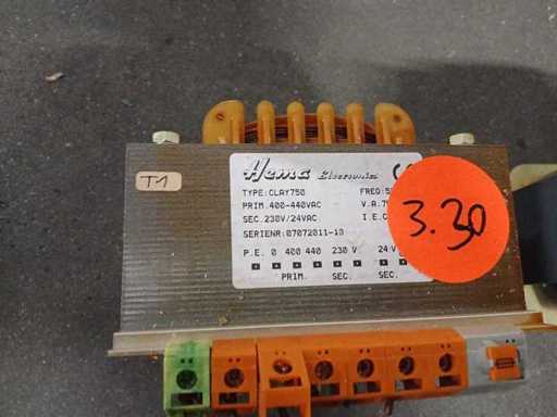 Sticker 8: Michael Riedel RSTN 630 transformer, a 1-phase control transformer Model: RSTN 630. Power: 0.63 kVA (continuous use) to 1.7 kVA (short-term use). Input Voltage (Primary): Adjustable to 380V, 400V or 420V AC. Output voltage (secondary): 230V AC. Amperage: Primary: 1.76 A. Secondary: 2.73 A. Frequency: 50/60 Hz. Sticker 9: single-phase transformer from the brand Michael Riedel Type: RSTN 250 Power: 0.25 / 0.69 kVA Primary voltage (input): 380 / 400 / 420 V AC Secondary voltage (output): 24 V AC Amperage: Primary 0.71 A; Secondary 10.41 A Frequency: 50/60 Hz Sticker 3.30: Hema Electronics, specifically the model CLAY750 It is an electrical device used to convert alternating current (VAC) to another voltage. Technical Specifications Input voltage (primary): 400V - 440V AC. Output Voltage (Secondary): Choice of 230V or 24V AC. Power: 750 VA (Volt-Ampere). Frequency: 50 Hz. Serial number: 07072011-10.