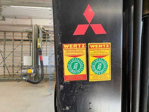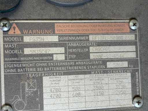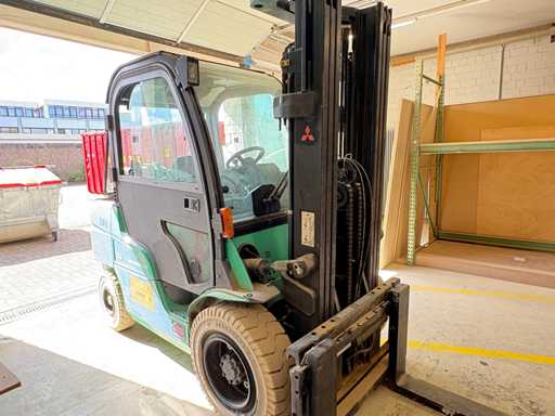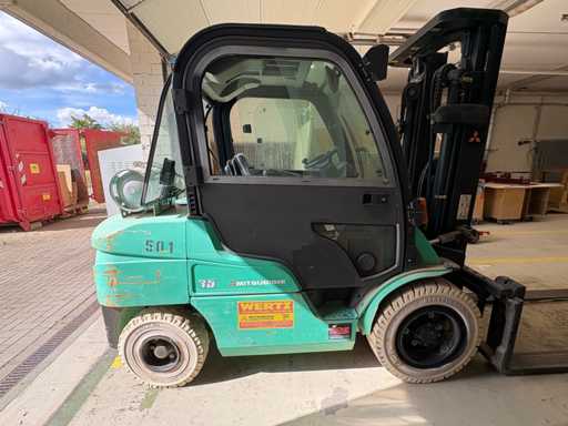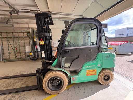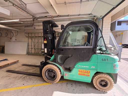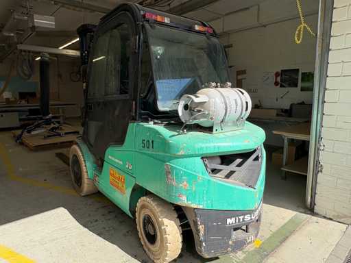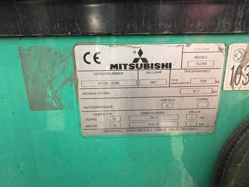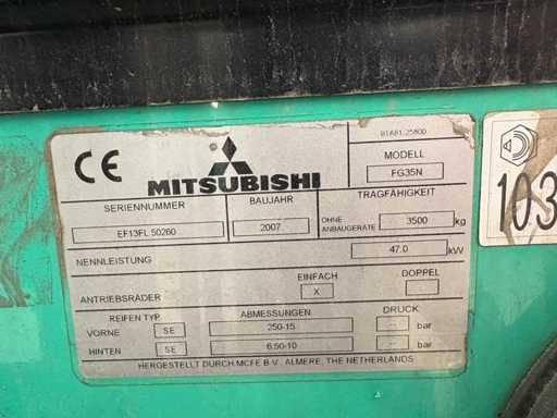 sale is a used gas forklift from the brand manufacturer Mitsubishi, model FG35N, built in 2007, with a load capacity of 3,500 kg and a fully enclosed driver's cab.