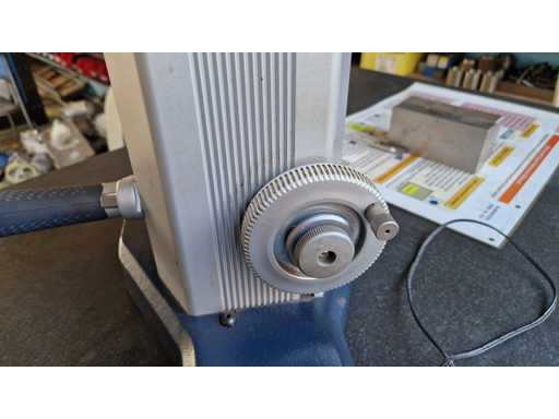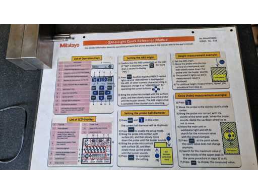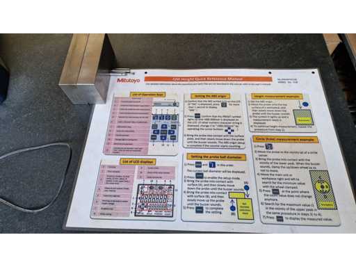 Remarks: Precision Mitutoyo height gauge (QM series). Suitable for workshop metrology and inspection. Complete with probe head and quick reference sheet as photographed. Ideal for quality control desks or toolroom measuring stations.