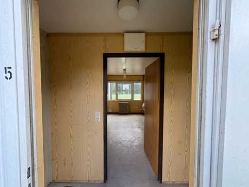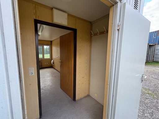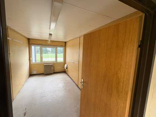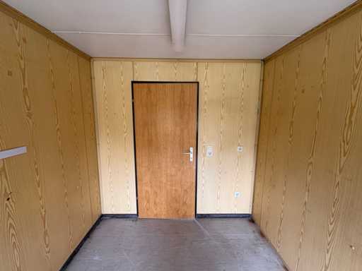 The interior walls are covered with light wood décor panelling, the floor is covered with PVC. The entrance door is lockable. On the outside, the container shows weather-related signs of wear such as dents, scratches and slight rust, but is leak-proof, dry and immediately ready for use.