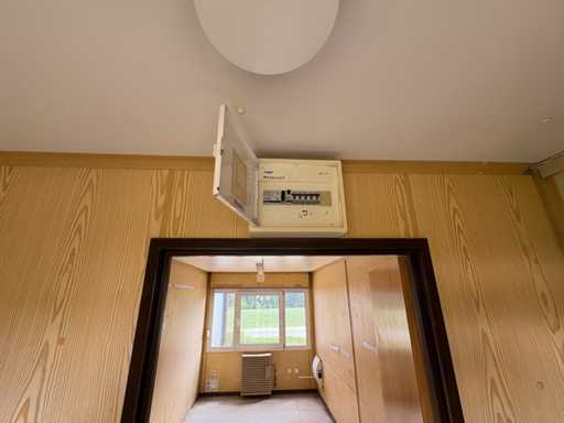 Windows and door are intact, the insulating glazing is undamaged. The door closes tightly, the interior is bright and clean. The fuse box (Hager) is fully installed. The walls are clad with wooden decorative panels, the floor shows normal signs of use.