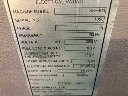 machine: MORI SEIKI SH 403 Horizontal Machining Center (Serial No. 1398)