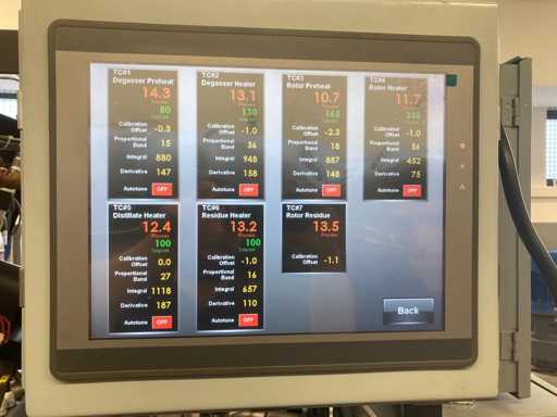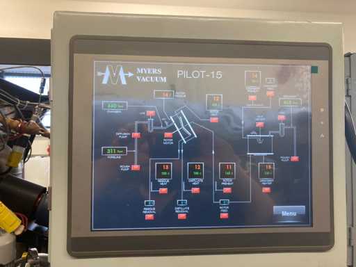 The PILOT-15 is a complete distillation system including all of the pumping, heating, vacuum generating and control equipment needed for plant operation. The small amount of floor space occupied by the unit helps make the PILOT-15, in single or multiple installations, a most attractive system. The touch screen control features an easy to follow system schematic. The PILOT-15 is designed for throughputs between 10 and 80 lb/hr (4.5 to 36 kg/hr), depending on feed material characteristics.
