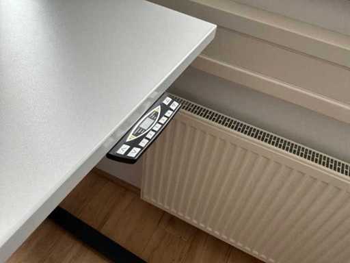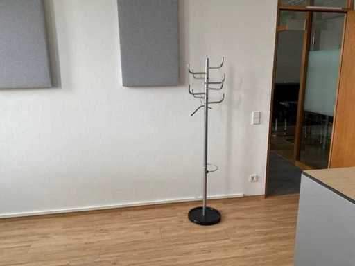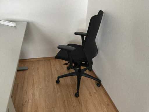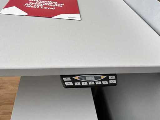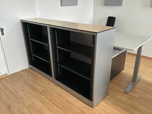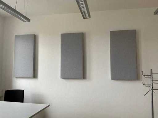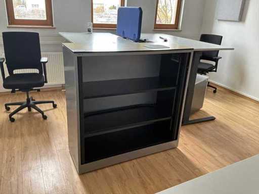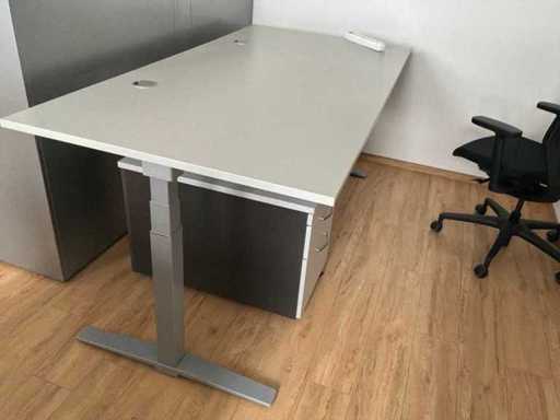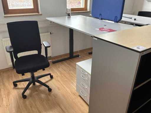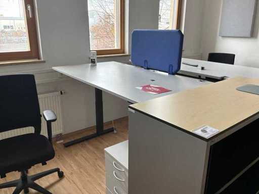 Best. 2 electrically height-adjustable, tables 1800 x 900 mm, 1 table 2,000 x 1,000, 3 office swivel chairs fabric cover black, 2 sideboards 1,200 mm high x 1000mm, 1 sideboard 1,200 mm high 1,200 lg, 8 wall-mounted acoustic panels, 3 office roll containers, 1 clothes rack,