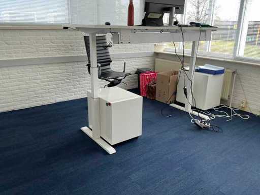 Consisting of 1x electrically adjustable Activorce, desk with drawer unit, 2x armchair, 1x sound-absorbing filing cabinet, 1x side table, 1x flip chart and 1x office chair, other items not mentioned not included. on the first floor, there is no elevator