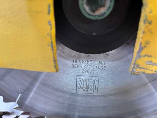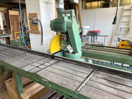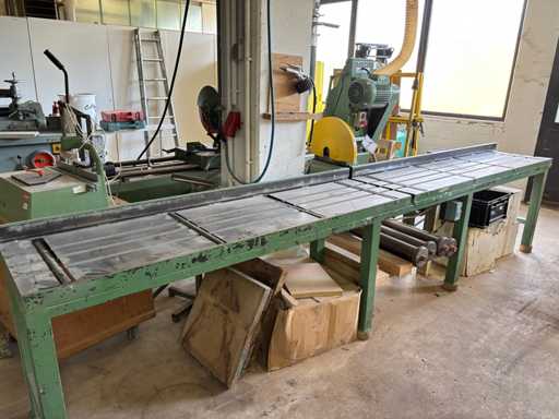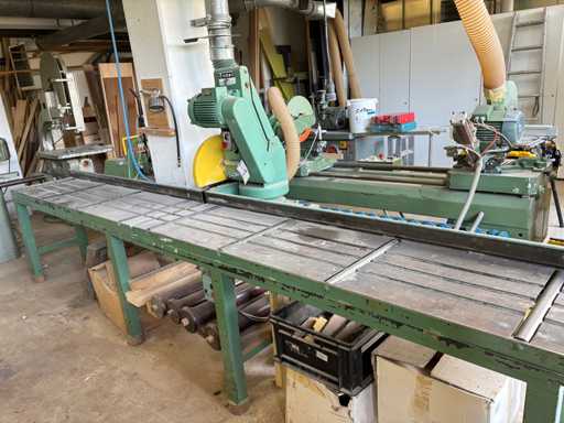 Saw unit motor approx. 5.5 hp and rotatable right/left each approx. 45° degrees, saw blade diameter approx. 350 mm, table with rollers and total length approx. 4040 mm, table depth approx. 490 mm, working height approx. 860 mm (The article is in condition as existing and unchecked. The dismantling and loading costs are binding! The item is sold without content / material!)