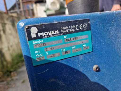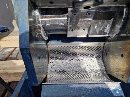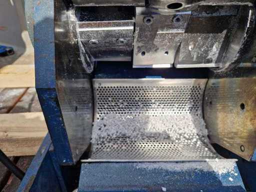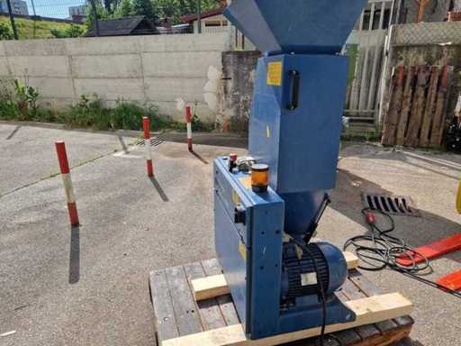 Granulator for plastic and brittle materials. Includes steel cutting chamber with rotating knife rotor, fixed counter-knives, and perforated screen for particle control. Bottom discharge outlet. Sound-dampened hopper-fed housing. Emergency stop and removable collection tray.