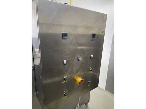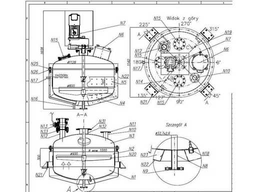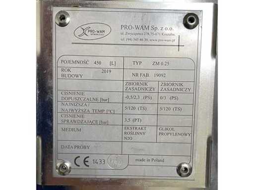 Tank manufactured in 2019, installed in 2020 - manufactured in the highest quality by the recognized company PRO-WAM from Koszalin, used several times and put aside due to a change in the process. Tank like new, in amazing condition, on wheels. Pressure up to 2 bar, with mixing and heating, made of stainless steel AISI 316L. Two UV light radiators have been additionally designed for the tank, mounted from the top through sight glasses.