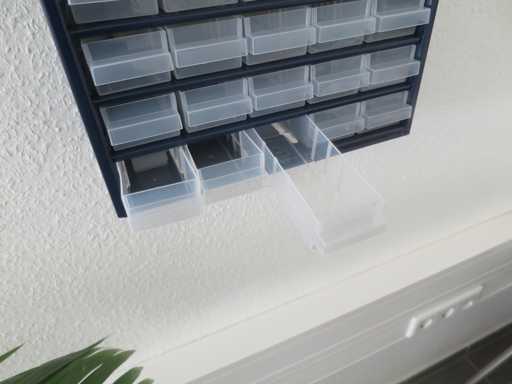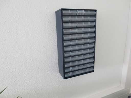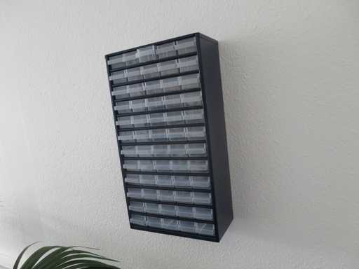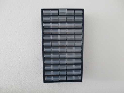 Raaco metal drawer box with 60 polypropylene drawers. The box is suitable for wall mounting.