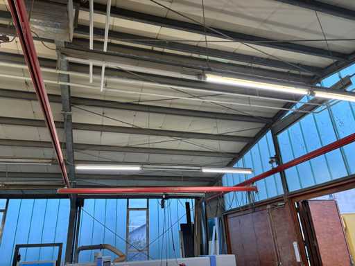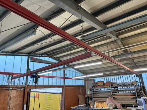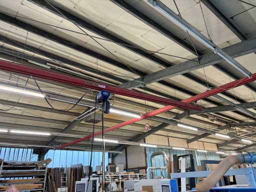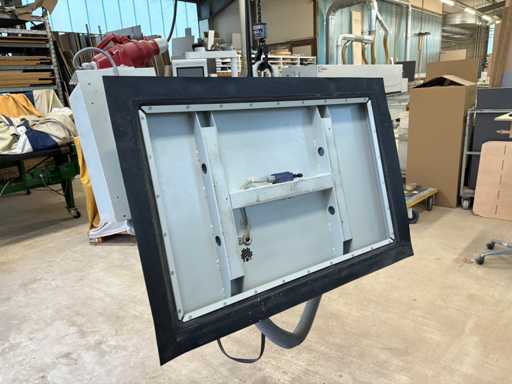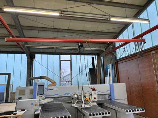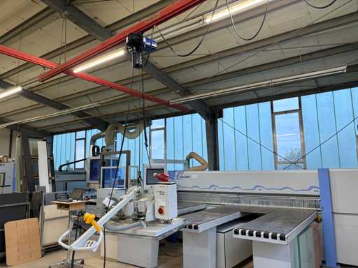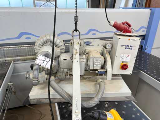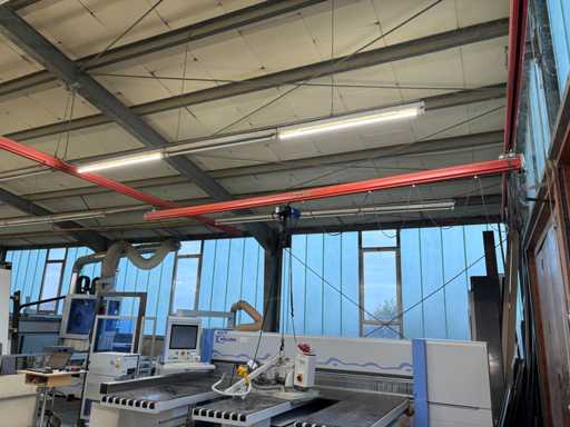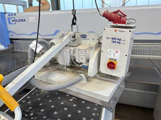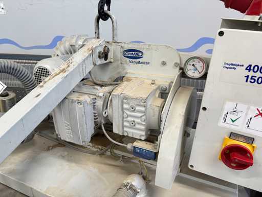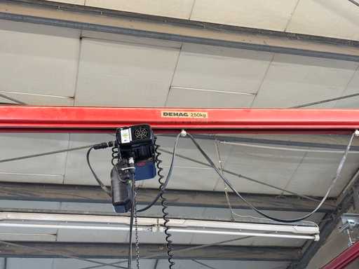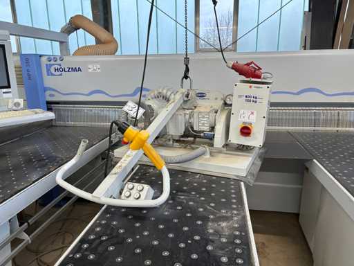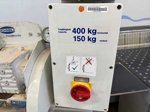 Suction plate approx. 900 x 570 mm, capacity horizontally approx. 400 kg and vertically approx. 150 kg, swivel electrically, Demag/Schmalz chain hoist with capacity approx. 250 kg, travel distance walked approx. 6000 x 14000 mm (The article is in condition as existing and unchecked. The article is sold from the foundation and without content / material!)