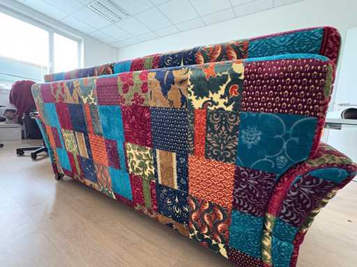 For sale are two high-quality design sofas from the German premium manufacturer Schröno, in the unmistakable patchwork boho style. With elaborate velour covers, striking colours and real backs, they are ideal as eye-catchers in lounges, receptions, agencies or living areas.