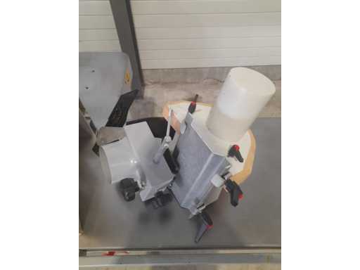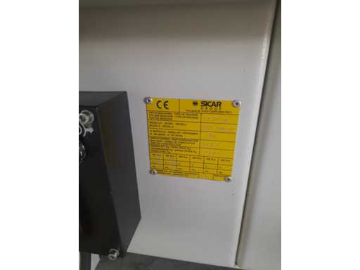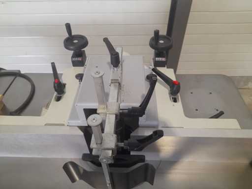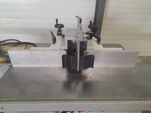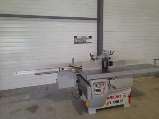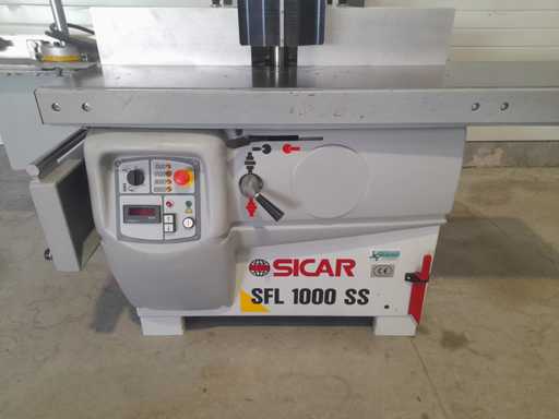SICAR vertical shaft router, model SFL 1000 SS, equipped with a large cast iron table, a Aluminum feed carriage and adjustable router guide with pressers. Robust machine for profiling and moulding operations, with digital display shaft height and control console with emergency stop.