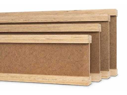 Wooden I-beams for roof, floor and wall constructions. Lightweight and strong, with efficient use of materials. Limited thermal bridges. Constructed from flanges of LVL or solid spruce (approx. 39mm thick) and an 8mm hardboard core. Industrially produced for consistent quality.