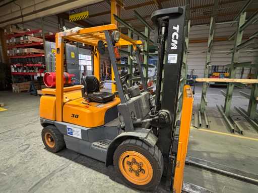For sale is a robust gas forklift from the manufacturer TCM, model FHG30T3Z, with a load capacity of 3,000 kg. The forklift is ideal for internal transport tasks – both in halls and in covered outdoor areas.