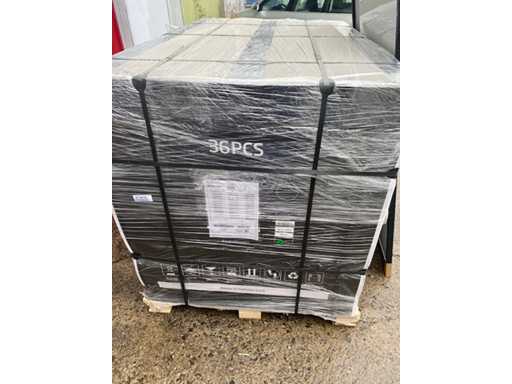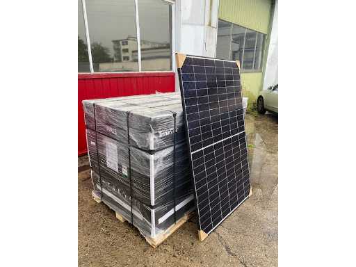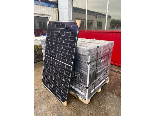 Brand new solar panels. Up to 450W permeability Excellent resistance to fire and in difficult environmental conditions 5,400 Pa snow load and 4,000 Pa wind load (test loads) Lower installation costs with increased power and efficiency. Maximum yield Total nominal power per pallet with 24 PV modules: 16,200 Wp /16.20 KWp Technical details: Type: monocrystalline. Condition: factory new Efficiency per solar module: 22.5%. Power per solar module: 450 Wp. Total output: approx. 16,200 Wp /16.20 KWp. Dimensions PV module: 1,762 x 1134 x 30 mm. Weight: approx. 21 Kg. Number of units: 36 pieces. Logistical data: Number of pallets: 1 Pallet dimensions: approx. 1,800 x 1,200 x 1,500 mm. Weight: approx. 800 kg