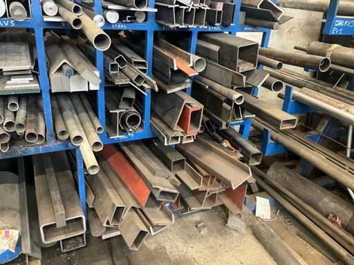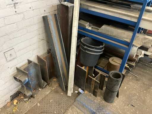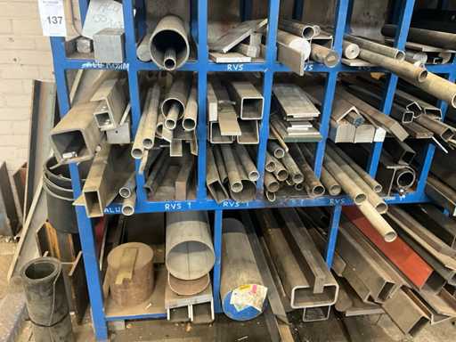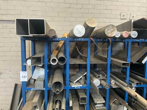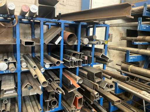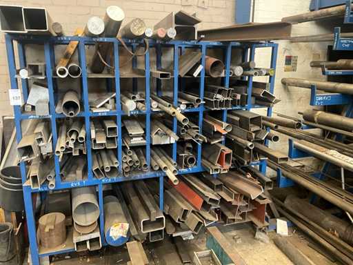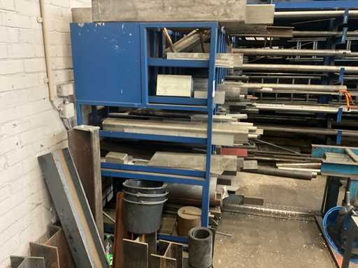 Content concerns various remnants of steel and stainless steel, longest length approximately 1700mm, dimensions of shelving 210x100x180cm