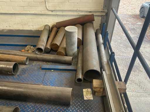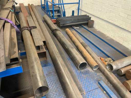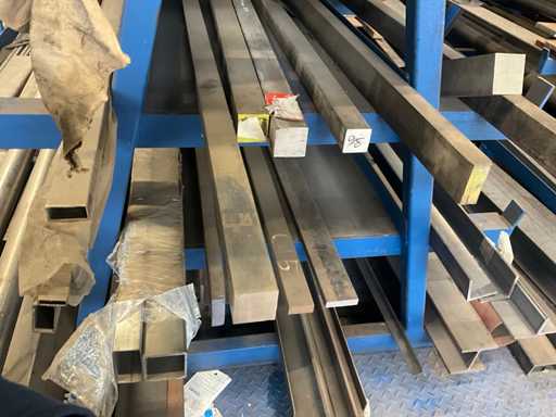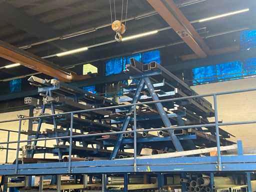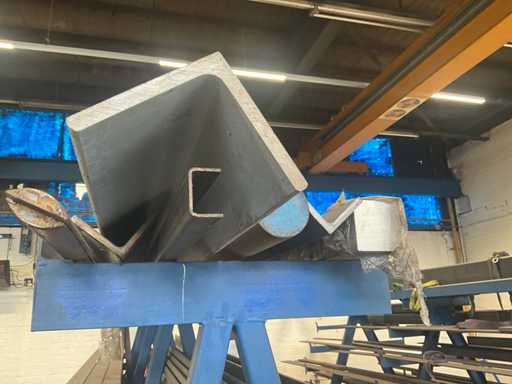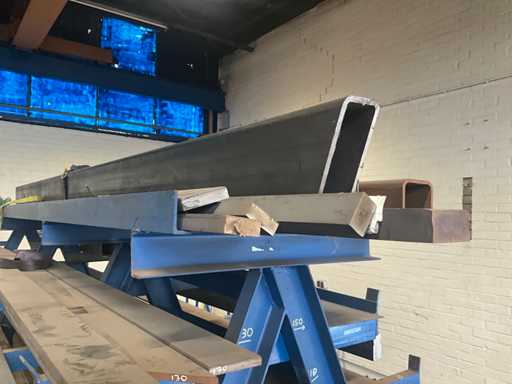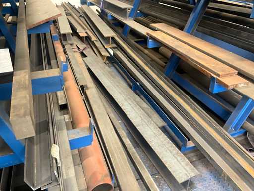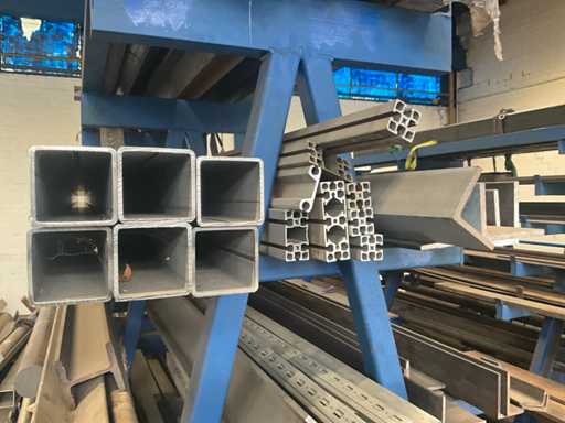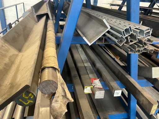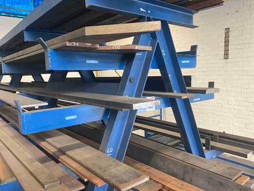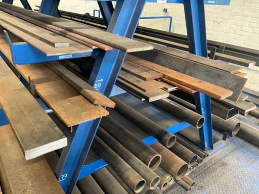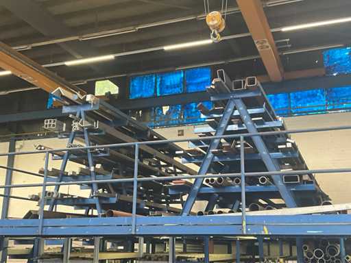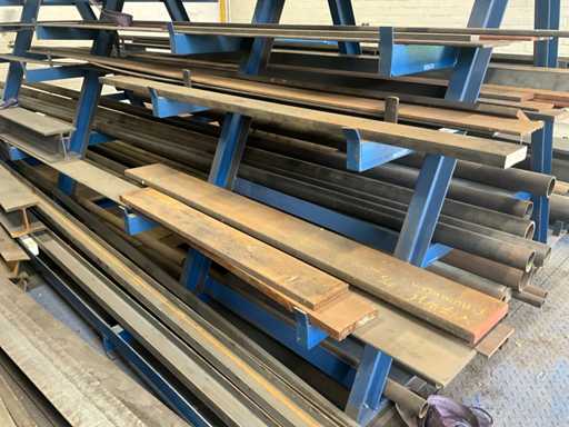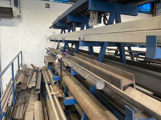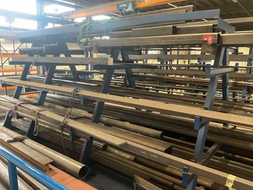 Various types and sizes of steel and stainless steel profiles, longest length approximately 6500mm. On and including 2x double-sided cantilever rack 4300x2600x2200mm.
