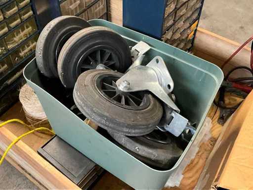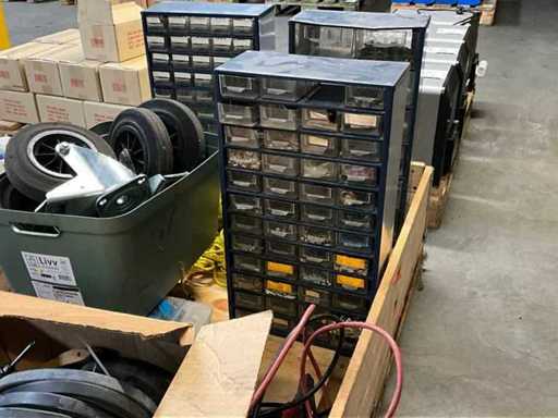 including: 2x pneumatic screwdrivers; various swivel wheels; 3x steel assorted box with various contents including nails; screws; glass fuses; rivets; without pallet box;