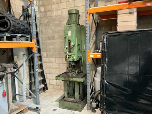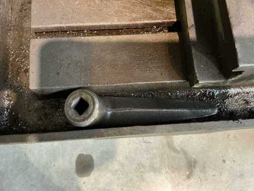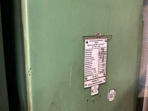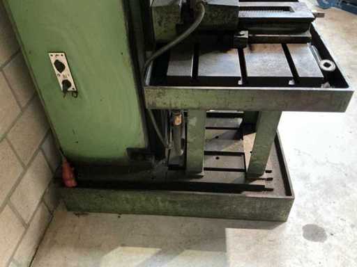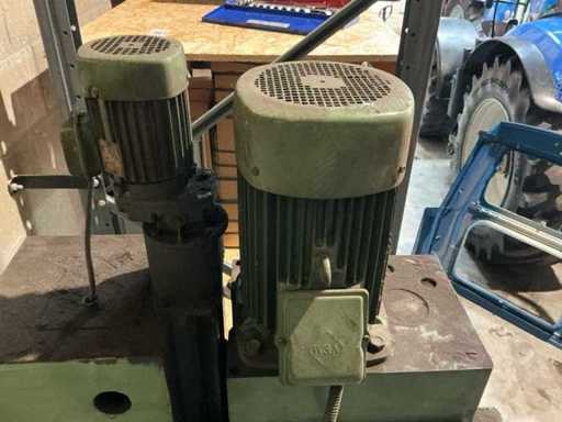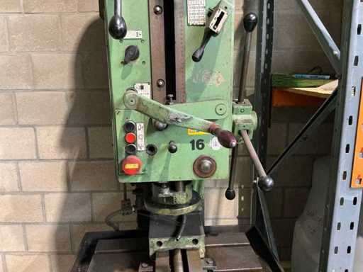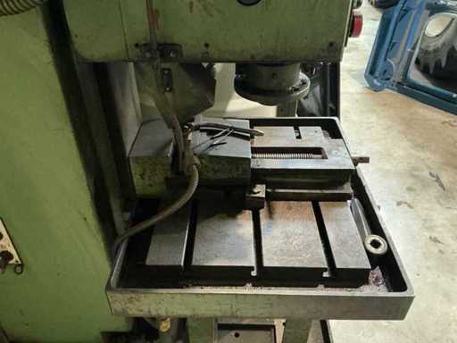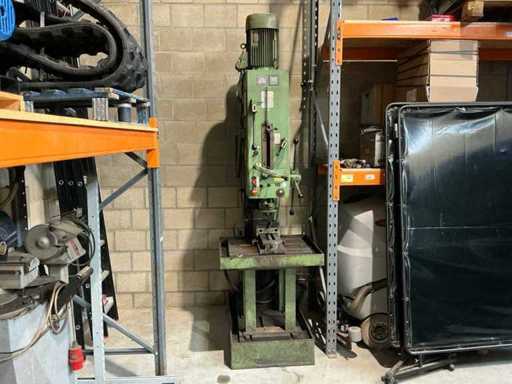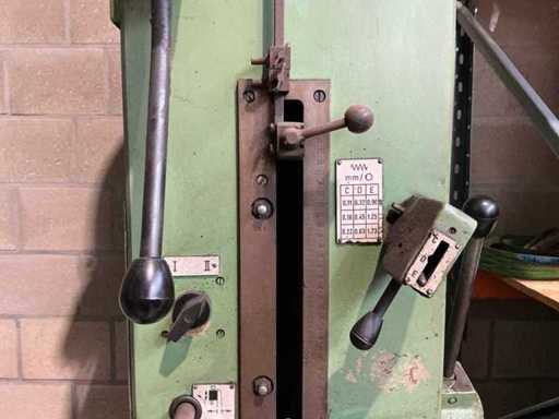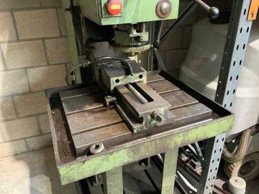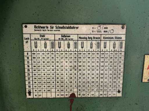 Lot: column drilling machine Heckert BK 50 AI incl. machine clamp and cooling, Heckert (VEB WMK "Fritz Heckert"), type: BK 50 AI, power supply: 380 V (3-phase), frequency: 50 Hz, power: approx. 6.8 kW, weight: approx. 1,680 kg, max. Drilling capacity: approx. 50 mm in steel, Speed range: approx. 45 – 1400 rpm (via gearbox), power supplies: approx. 0.11 – 1.73 mm/rev. (adjustable), gearbox with speed settings (A/B and I/II), manual and automatic feed, depth stop with scale, built-in coolant installation with flexible hose and shut-off valve, control switch for machine and cooling pump available, material and speed tables on the machine, including machine clamp (table mounted)