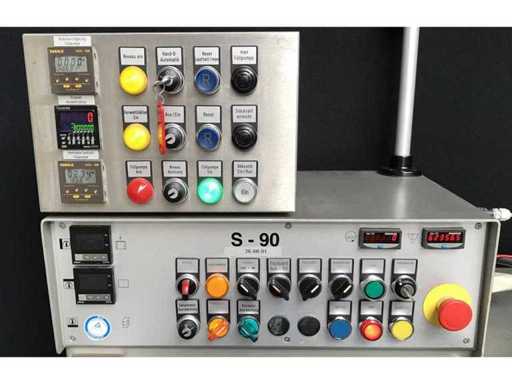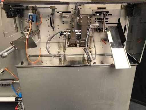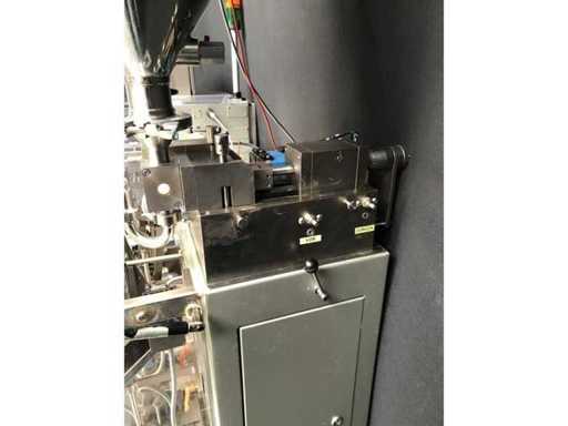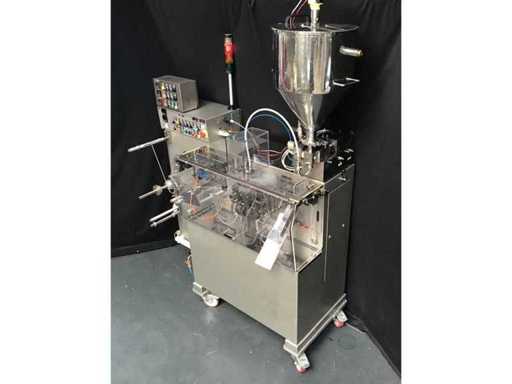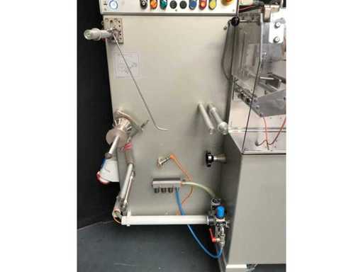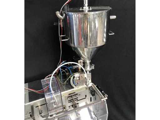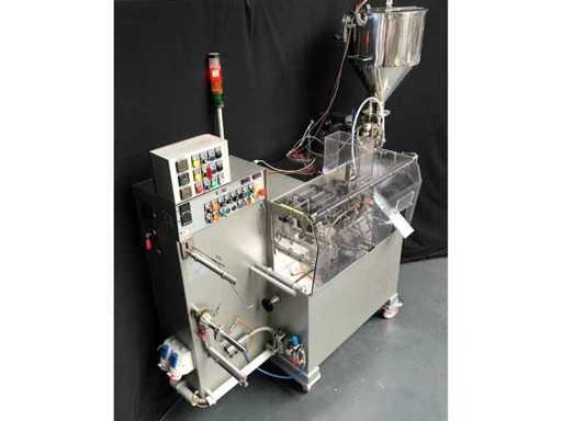 This Machine is designed to form, fill and seal of Flat sachets with pastes, creams or similar products. This Machine is working intermittently at an infinitely variable speed of max. 100 cycles/min. Min. Max. Wide 45 mm 90 mm Length 50 mm 115 mm Dosing volume 0.25 - 35.0 cm3 The product will be filled in a stainless steel container with a capacity of approx. 20 liters - heatable via jacket. The product is dosed using pneumatic cylinders and can be regulated up to a maximum of 10 ml using a micrometer. The dosed filling quantity is filled into the sachets via a filling funnel.