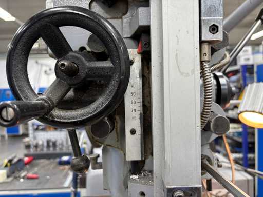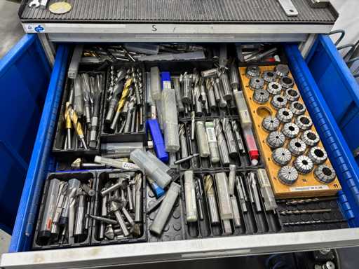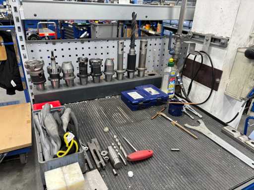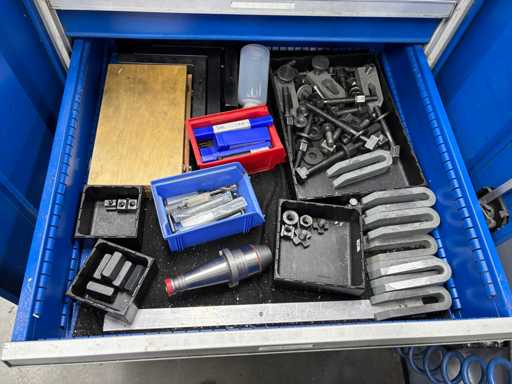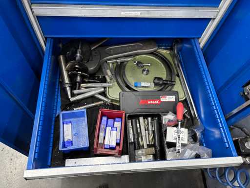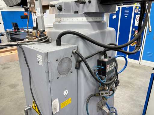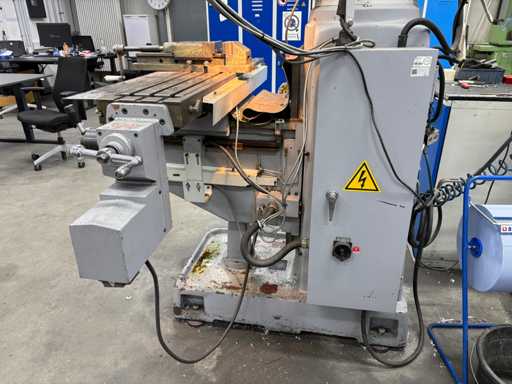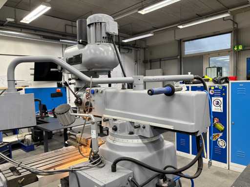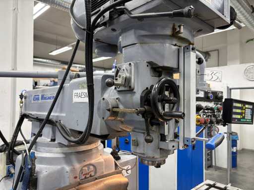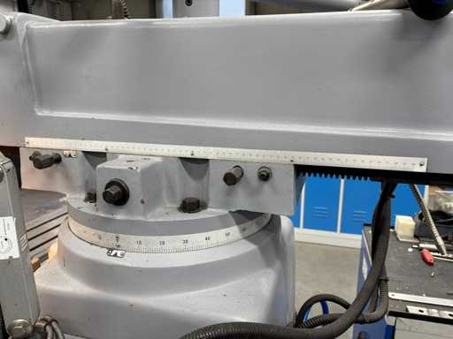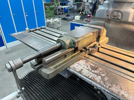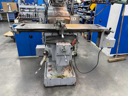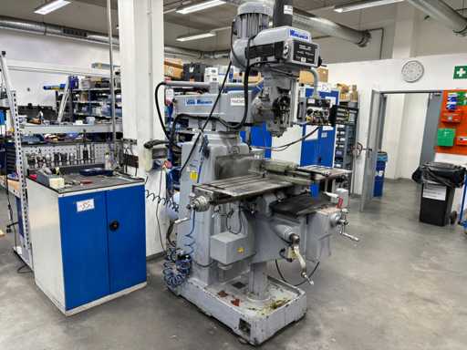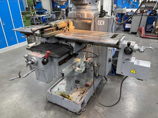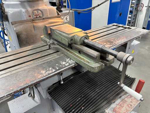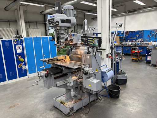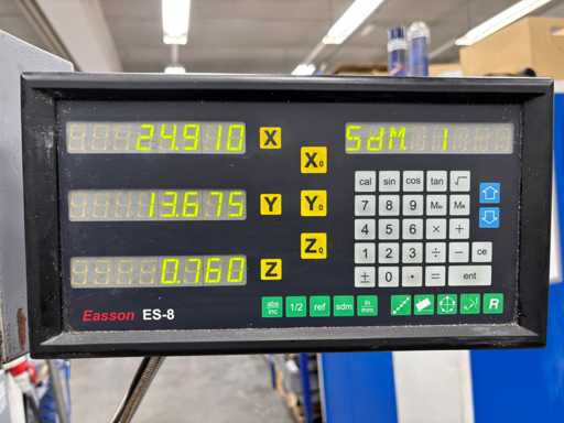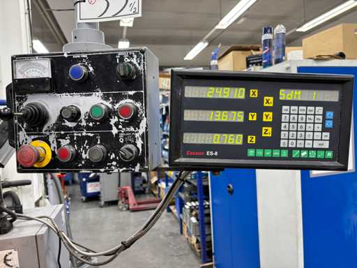 Machine No. 12020, milling machine with 3-axis digital display Easson ES-8, table with grooves, table length approx. 1200 mm, table width approx. 250 mm, vertical milling head swivel and ISO 40 tool holder, variable speed, vise jaw width approx. 130 mm, cabinet with accessories (ISO 40 holders, milling cutters, drills, collets (Attention: without guarantee of completeness!)) (The article is in condition as it is and unchecked. The article is sold from the foundation and without content/material! There are no pallets available for dismantling and loading the item, other packaging material on site and the buyer has to rent a forklift, tank rollers, machine jacks, etc. at his own expense if necessary!)