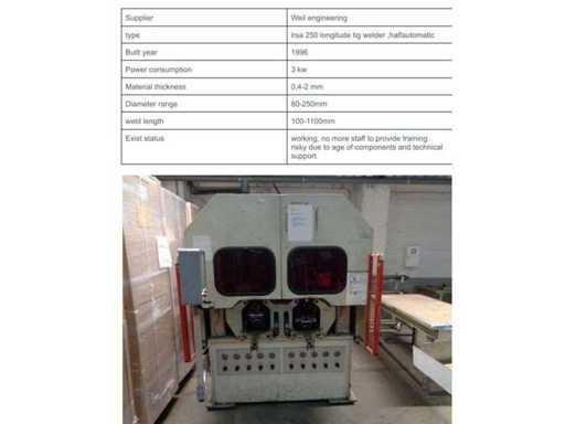 capacity: ø 80-250mm, material thickness: 0.4 -2 mm, tube length: 100 - 1100mm, equipped with REHM Tranwig 360 G welding current source, welding current range: 6A/ 10V - 360A/ 34.4V, 1 cooling installation, 1 Schneider Magalis Electric touch operator panel, main current cabinet, 1 Telemecanique light curtain personal protection and cassettes, ø 80, 100, 130, 150, 200, 250mm