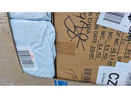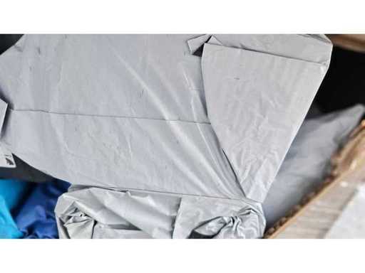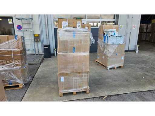 Estado: Nuevo/sin usar • Notas adicionales: El lote incluye (1) Coche eléctrico de tracción infantil (dimensiones de la caja: 101x55x27 cm, peso general 12 kg); (2) Múltiples bolsas de polietileno y paquetes sellados (probablemente que contengan ropa, electrónica o artículos para el hogar); (3) Cartón con el contorno de un juguete deportivo para montar; (4) Trampolín en caja con red (icono visible); (5) Caja con dimensiones 48,5 x 44 cm, peso general 9,0 kg; Contenido no completamente identificado. • Palé de bienes de consumo mixtos.