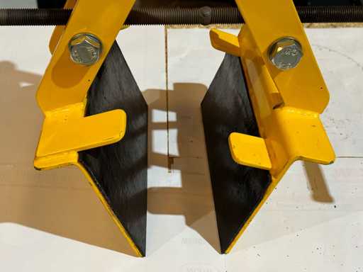 Pinza mecánica vertical para elevación de placas, con eje de tornillo ajustable y mordazas de sujeción endurecidas. Adecuada para la manipulación y elevación de chapas o placas en entornos de fabricación.