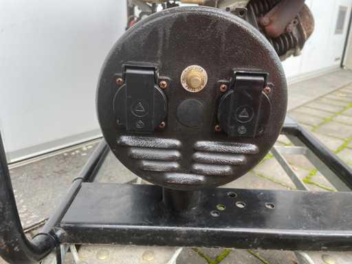 The generator is functional and shows normal signs of wear for its age. Visual inspection revealed no leaks or damage to the engine block. The engine starts manually and runs smoothly. Last service documented on 14.10.2025 (oil, air filter, spark plug). No operating hour meter installed. Wheels in order, carrying handle stable. Paint with scratches and signs of wear, but no structural damage recognizable. Instructions are missing. Packaging not available.