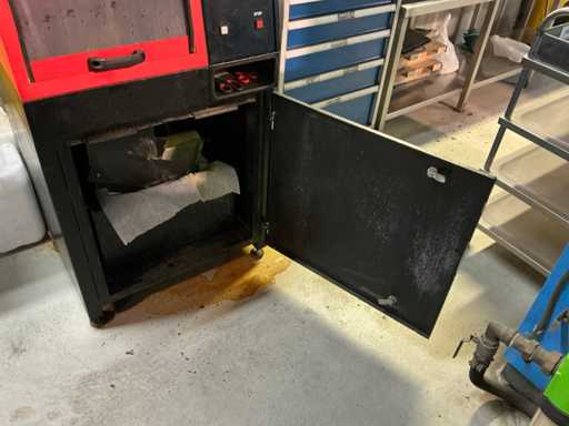 Armario cerrado con panel de control y compartimento de almacenamiento de herramientas en la base.