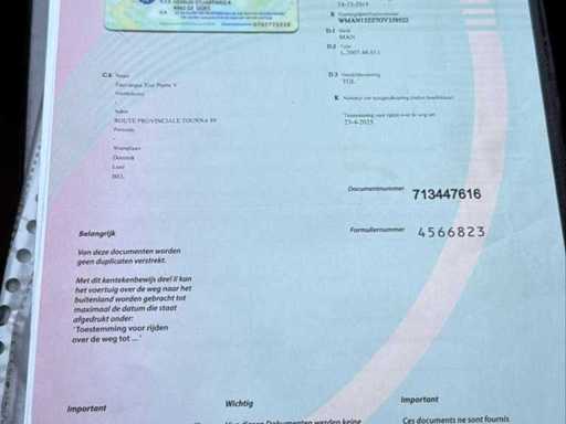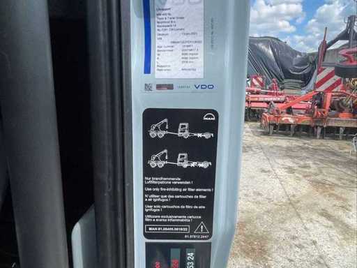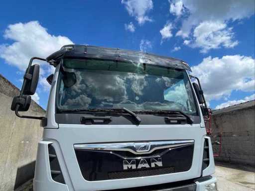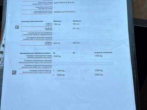 MAN TGL 7.180 – Tailgate Truck MAN TGL 7.180 straight truck, equipped with a closed body and a reinforced tail lift, intended for transport and distribution. General information Brand / Model: MAN TGL 7.180 Registration : 24/12/2015 Mileage : 174.000 km Fuel: Diesel – Euro 6 standard Colour: Grey Gearbox: Automatic Cabin: 2 seats Equipment Air conditioning Cruise control Navigation system Backup camera Reinforced tail lift (capacity approx. 1,500 kg) Tailgate remote Manufacturer documentation present Dimensions & capacities Total length: approx. 790 cm Gross vehicle weight (GVW) : 7.490 kg Payload: approx. 2.225 kg Status Vehicle from professional use Clean and well-maintained cabin Cash register in good general condition Load floor with signs of use Presence of a crack in the windshield