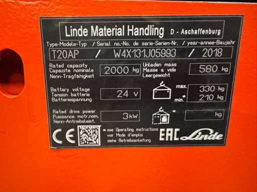 2017 S+UVV 07/2026 Transpaleta eléctrica apiladora Linde T20AP 2.000Kg ant 3.162 horas