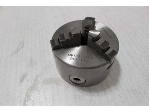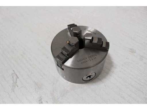 3 UNIDADES/JUEGOS DE ATT0027 EMPAQUETADOS JUNTOS. UNA SOLA ATT0027 CORRESPONDE A: Fusil para torno autocentrante 3 + 3 mordazas 100mm, 3500 r/min, cuerpo en hierro fundido rectificado, cierre con anillo helicoidal, sujeción manual concéntrica, mordazas templadas