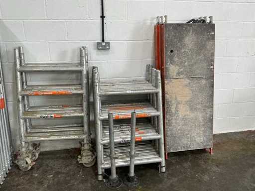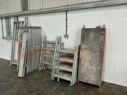 Walk through frames (Qty 4), 1500mm guards rails (Qty 10), 1500mm tow board, 1000mm frames (Qty13), 1500 trap door decks (Qty 3), Fixed feet adjustable (Qty 2), Adjustable wheels (Qty 8).