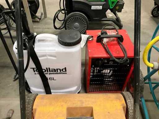 Barrendera, calefactor, esparcidor de sal, rociador de mochila y carrete de manguera