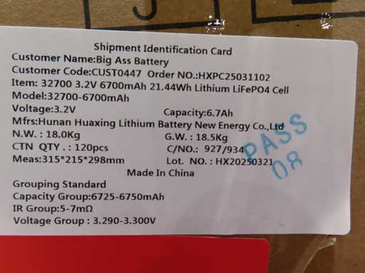3,2V, 6700mAh, 21,44Wh. Se refiere a 1 palé completo con 48 paquetes de 120 piezas.
