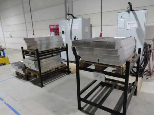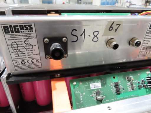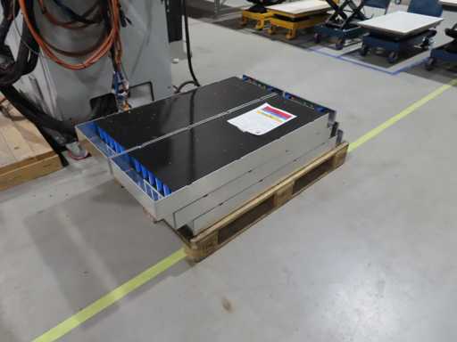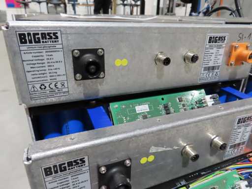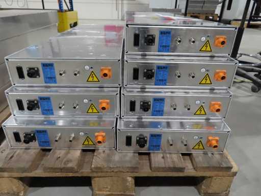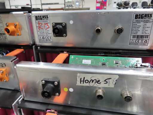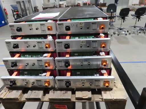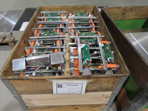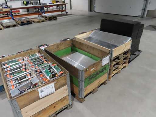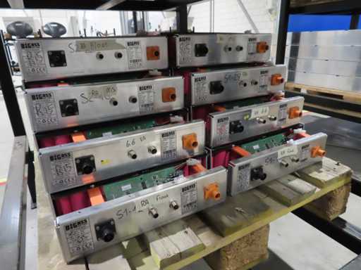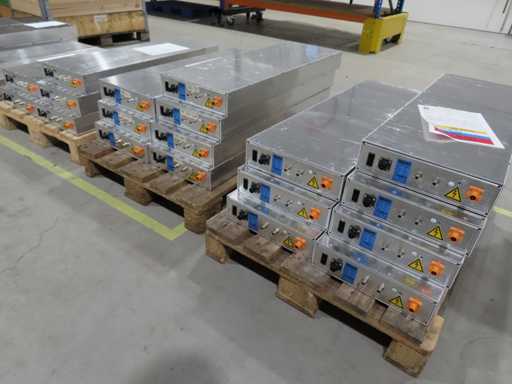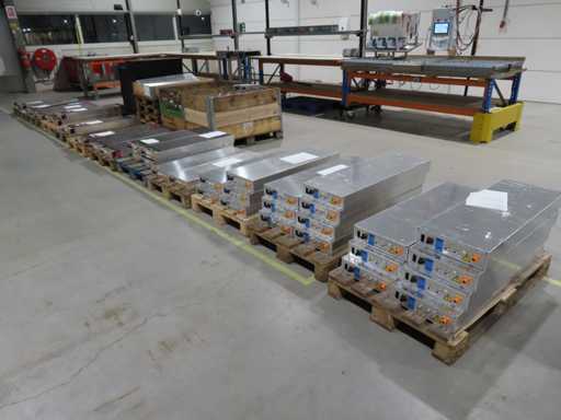 aproximadamente 165 baterías, en varias fases de producción, pruebas y recuperación, en parte sin cubierta superior. LiFePO4. Afecta a todas las baterías en el centro de pruebas. Incluye algunos accesorios.