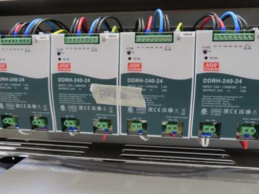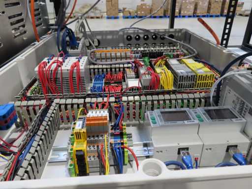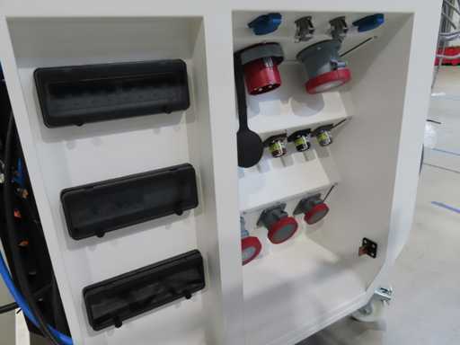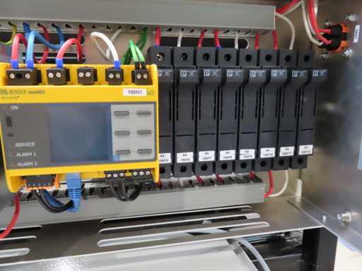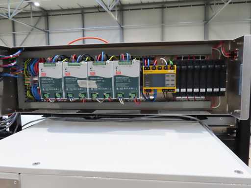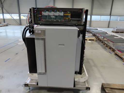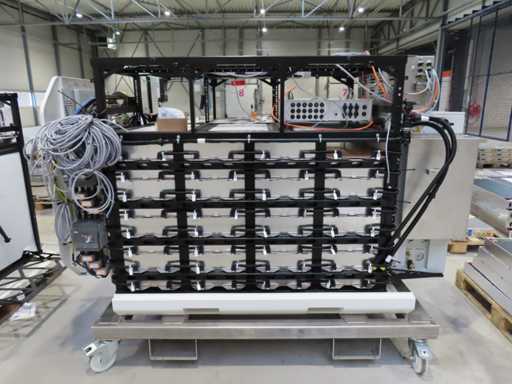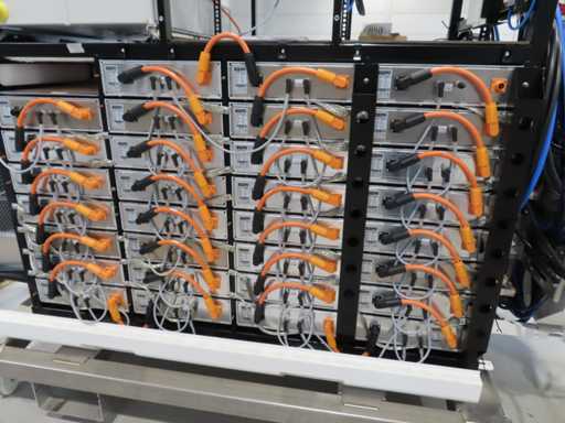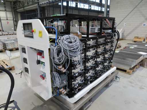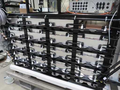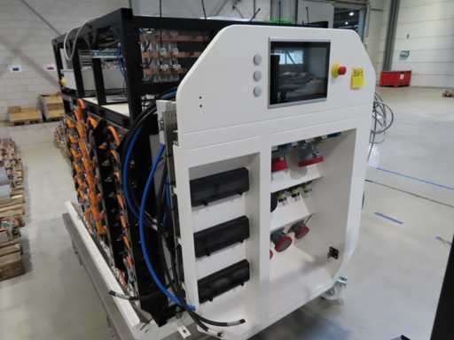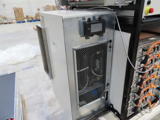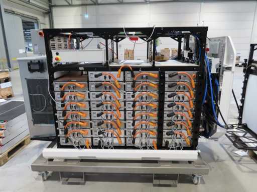 sistema de almacenamiento de baterías en construcción, compuesto por 31 baterías de 7,0 kW, control PLC, caja de conversión, refrigeración y varios accesorios, sobre chasis móvil de acero inoxidable. Dimensiones aproximadas: 143x240x138 cm (hxxd)