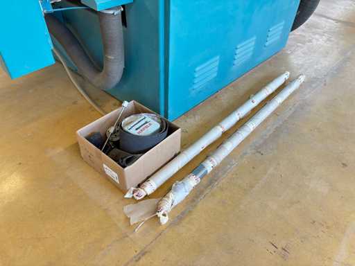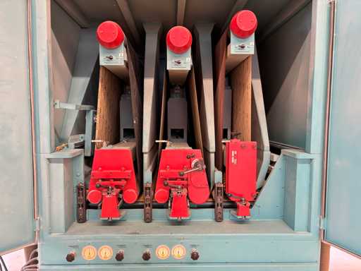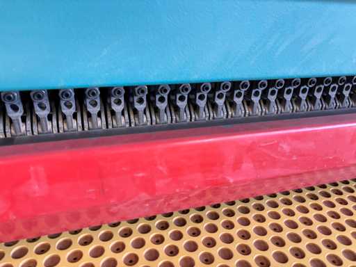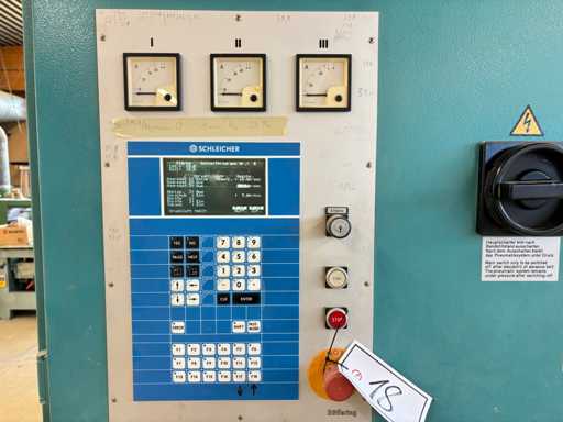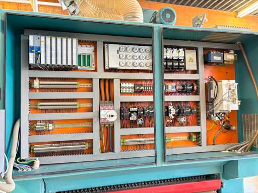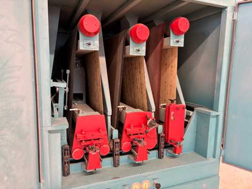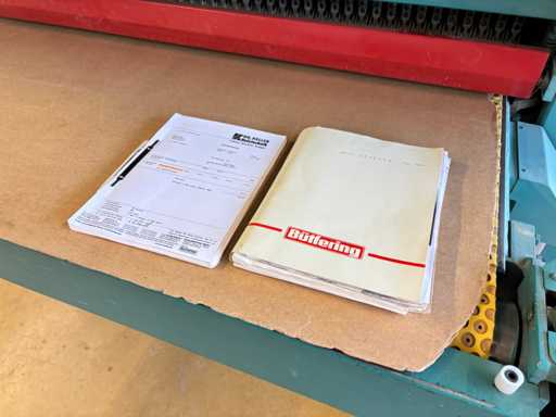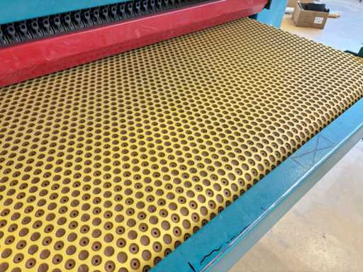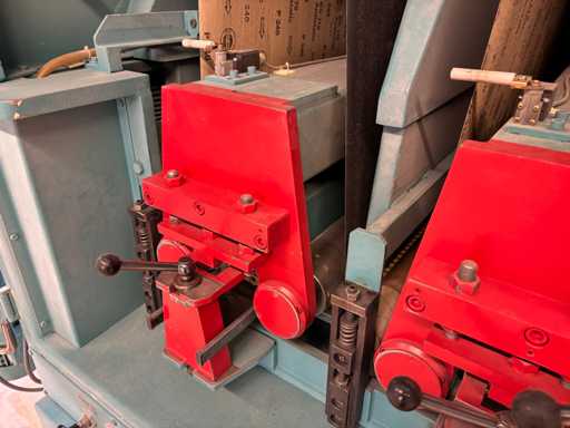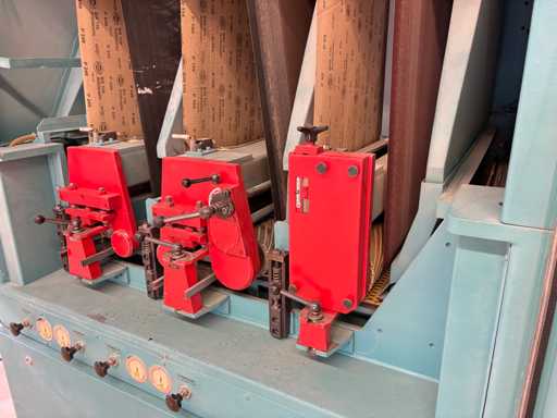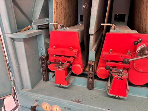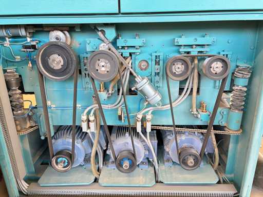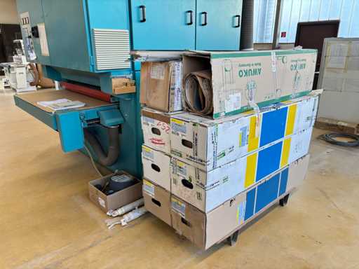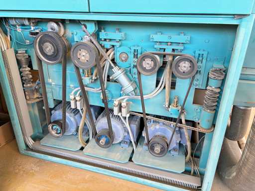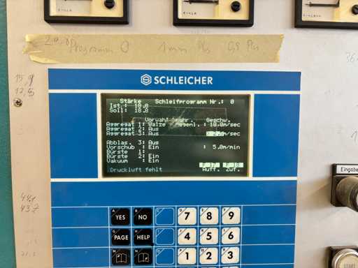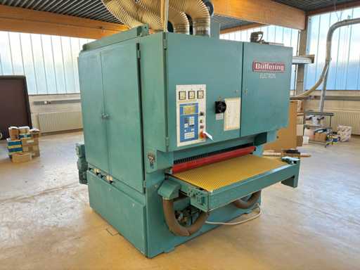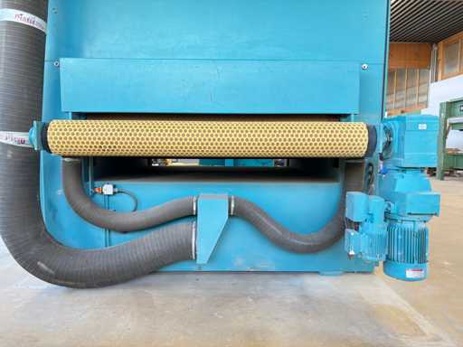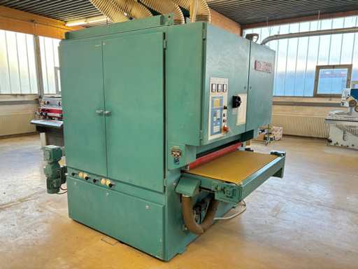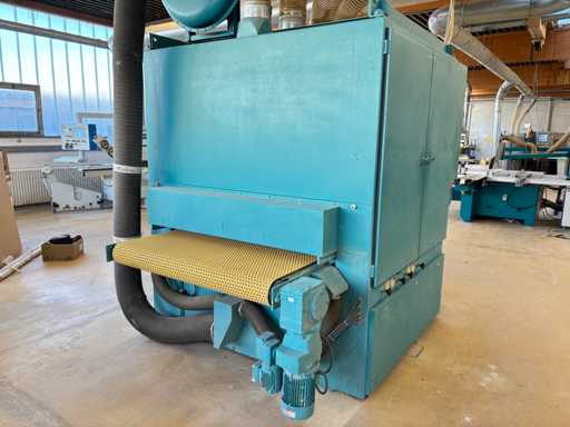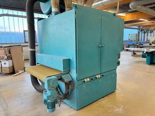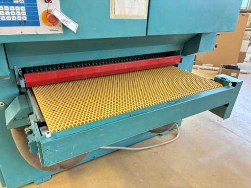 Máquina nº 2929299, ancho de trabajo máximo aprox. 1350 mm, altura máxima del paso aprox. 150 mm, primera unidad de rodillo de contacto con nervadura de goma (motor aprox. 18,5 KW y velocidad aprox. 18 m/seg.), segunda unidad combinada con rodillo de contacto con goma acanalada y zapata de lijado (motor aprox. 11 KW, velocidad aprox. 18 m/seg. y electrónica), zapata de lijado fino de 3ª unidad con barra de presión electrónica y ancho de segmento aprox. 30 mm (motor aprox. 11 KW, velocidad aprox. 2,5 - 20 m/seg. y electrónica), cepillo de limpieza, banda de alimentación con dispositivo de tensión al vacío 5 y 10 m/min., control PLC con memoria programa, banda abrasiva aprox. 1350 x 2620 mm, cintas abrasivas (el artículo está en condición existente y sin revisar. Los costes de desmontaje y carga son vinculantes y el artículo se vende sin contenido ni material).