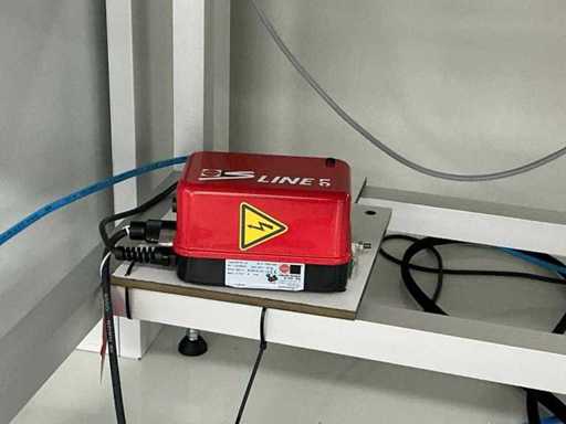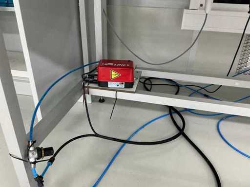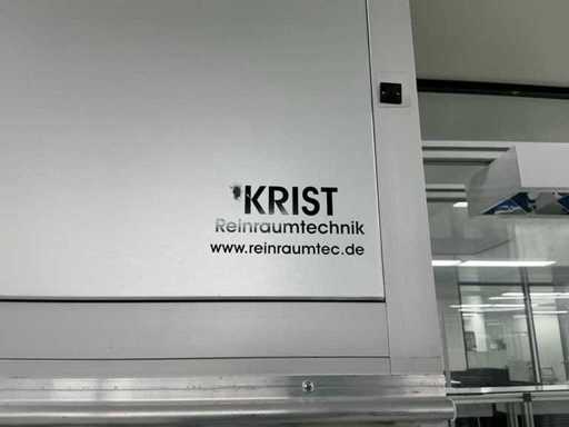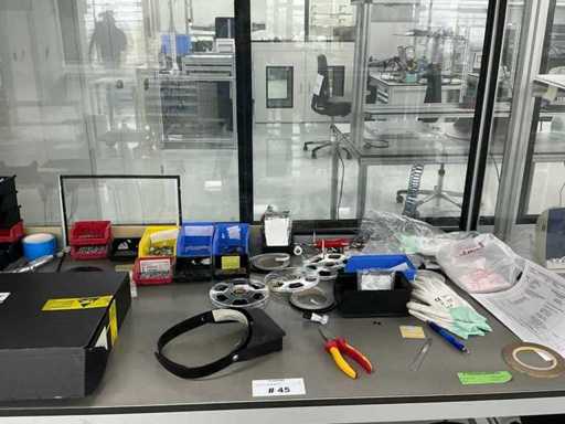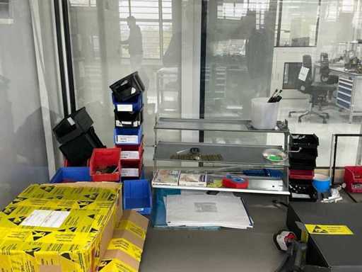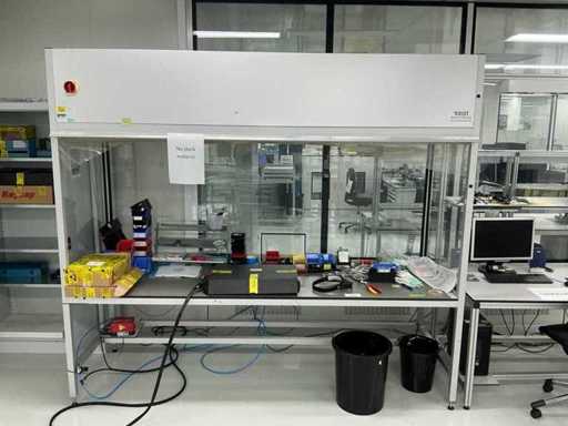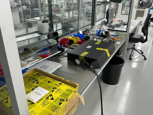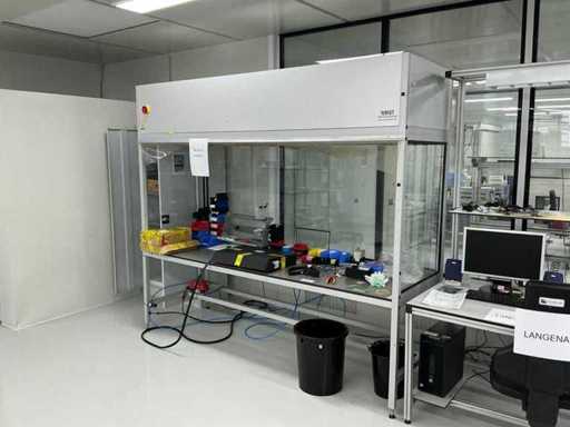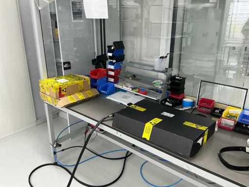 La estación de trabajo consta de 1 mesa gris claro con un marco de perfil de aluminio, 1 fuente de alimentación Haug EN SL LC con descarga, función. Fuente de alimentación de alta tensión para neutralizar cargas electrostáticas en superficies y 1 cabina de limpieza Krist, entre otras.