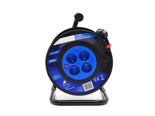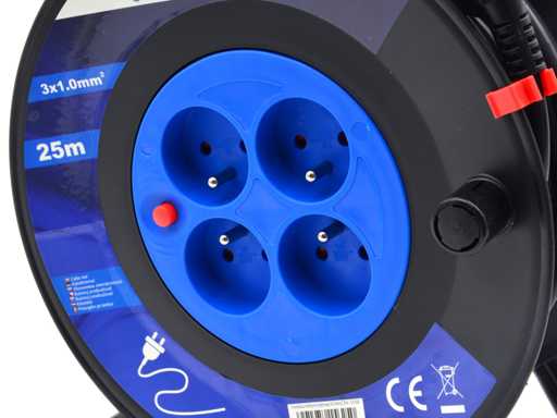 Rollo giratorio, con extensión de 25 metros, equipado con n. 4 tomas schuko y interruptor de seguridad, nunca utilizado