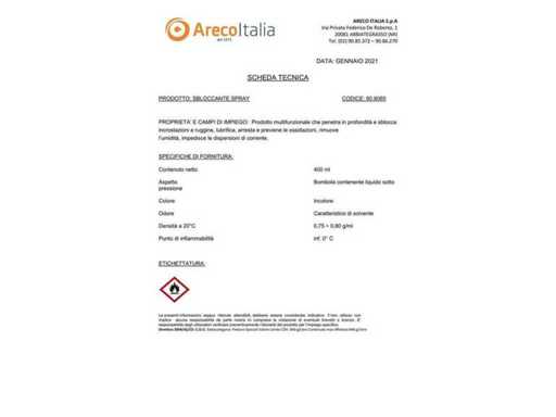 Desbloquea, lubrica, protege, permite la penetración capilar, disuelve el óxido, facilita el funcionamiento de los candados y el movimiento de bisagras y conexiones roscadas. Elimina el ruido y los chirridos, expulsa la humedad y la condensación en los circuitos eléctricos; Previene la corrosión y afloja la suciedad. En lata ml 400, aprox. 12 piezas, CON PAJA.