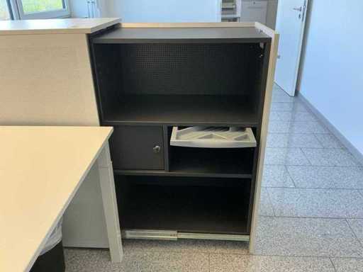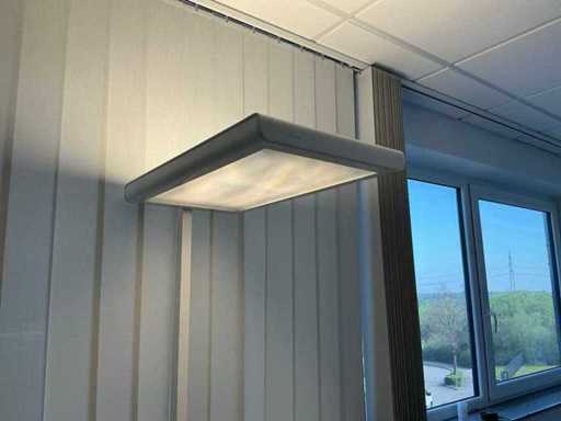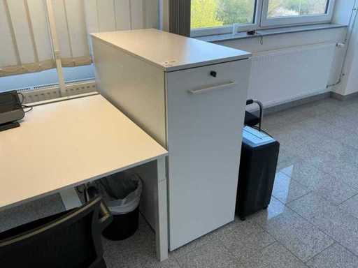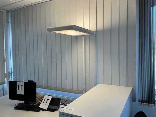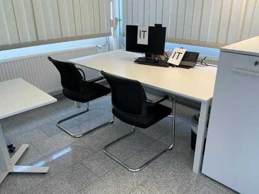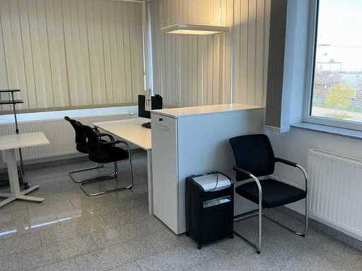 Incluyendo 3 sillas de oficina Dauphin, 58 x 58 x 87 cm (Ancho x Ancho x Alto), altura del reposabrazos: 65 cm; Un archivador de la marca Ophelis 114 x 50 x 114 cm (LxWxH) de profundidad 40 cm; Un escritorio de 200 x 100 x 73 cm (LxAn/H) Altura ajustable; Una lámpara de oficina de la marca ZumTobel de 200 cm de altura y 40 x 70 cm, una trituradora de papel de la marca Dahle de 36 x 26 x 56 cm (LxAn/Ar), sin monitor ni teléfono
