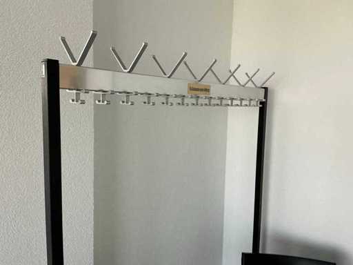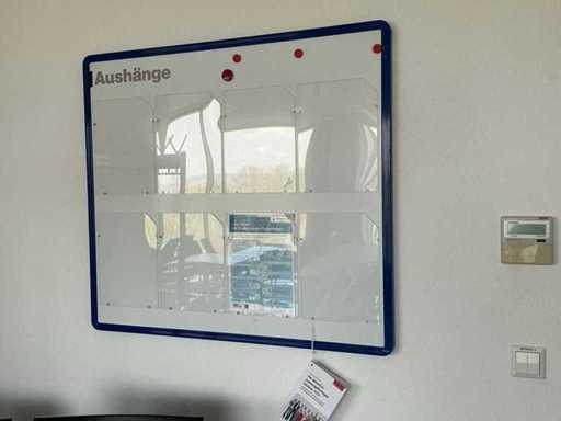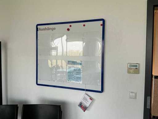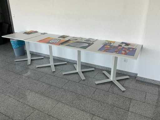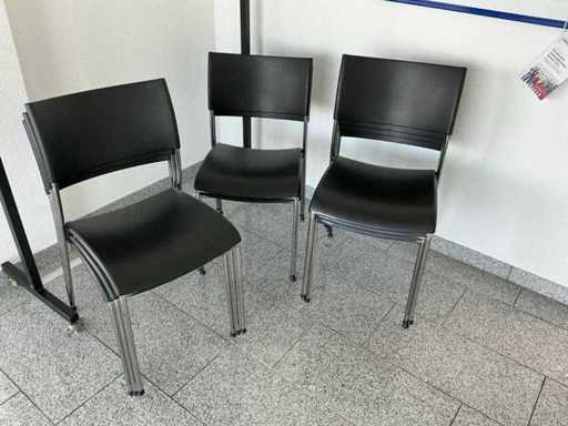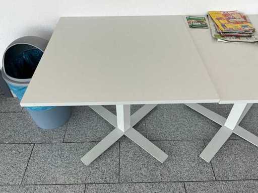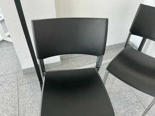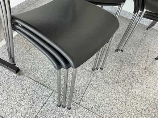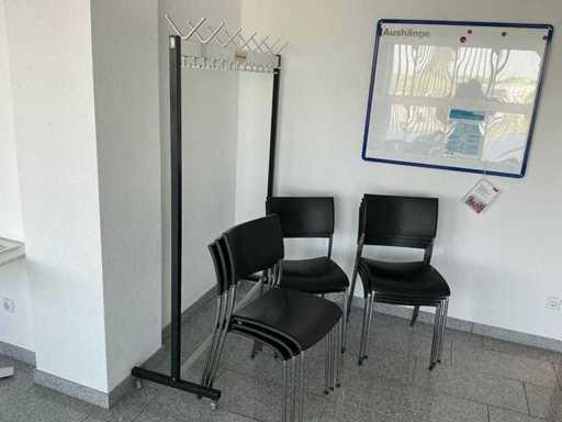 Contenido: 4 mesas de 95 x 95 x 73 cm (L/P/H), 9 sillas de oficina negras, 1 pizarra y 1 perchero