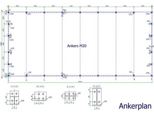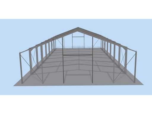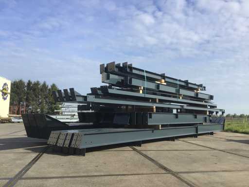 2 cerchas de extremo: 2 x columna de esquina H160, 2 x viga de techo H120, 2 x columna intermedia I200, 2 x columna intermedia U220 y 1 x viga de puerta U220 a 4,50 mtr.