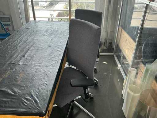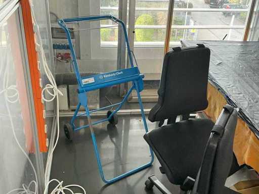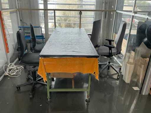 cristal que incluye: una mesa central, cuatro sillas de oficina y un carrito, entre otros.